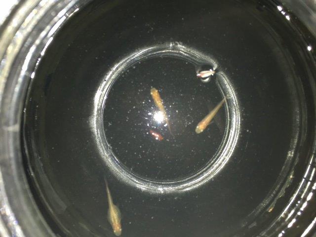 成程、小さい固体のお亡くなりになった魚体が底にちらほらとありました。エビのえさにならずに綺麗な状態であることからエビさんたちは全滅したのかな?と思ってしまいます。ホテイアオイの枯れた根っこでひっそりとしているのかもしれませんが、200匹近くいたと思われていた容器の中には50匹ほどしか確認がとれませんでした。半数以上はお亡くなりになっていたようです。