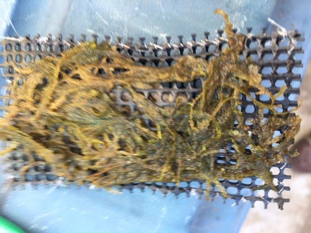 昨年モスだけ別の入れ物に取り分けてネットに根付かないかと分けていたものがあったのですがまったく根付かず・・・更には緑色だったのに黄土色に変色、氷が張ってかれたのかな??と思っていたのですが、その黄土色のモスをヌマエビオンリーの飼育槽に一株入れて数日したら、なんと緑色が戻ってきておりました。変色の理由はわかりませんが生きていたようですね。危うく捨てようと思っていたのですが、気をとりなおして、モスマットを作成しようとおもいます。準備したものは、プランターの下に敷く網目のマットと3号のテグスと石。ネットで見るとおはじきなんかでおもしにするようですが、手ごろなものがなかったので庭に落ちてた小石にしました。