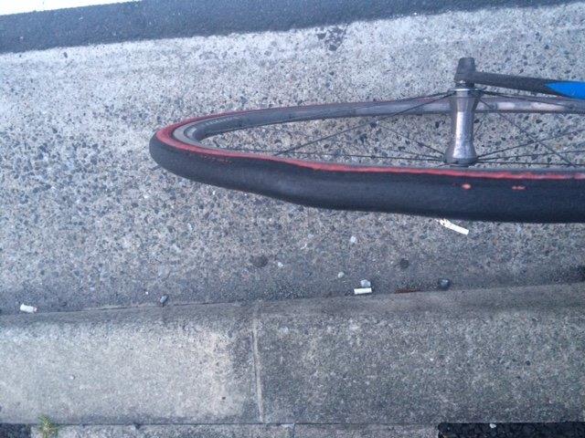 普段乗っているチャリの前輪です。見てもらうとわかりますが、タイヤが波うってます。