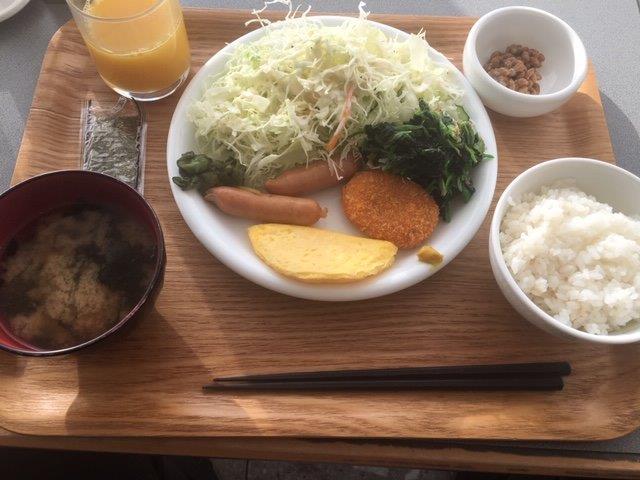 これは三沢、場所柄か、ホテルには結構な外人さんの宿泊者がいます。なので脂っぽいものが多いのかなと思っていましたが、意外とシンプルな朝食です。納豆しかなかったですがここも肉は少なめ。ほかのビジネスよりもソーセージが長く感じました。外人対応か?