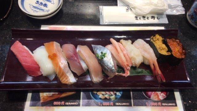 このラーメン長浜系なのですが、何故かモヤシが入ってました。そんなの有りなの?しかし、味は良かったです。翌日はお昼にキトキト寿司でランチを頂きます。特上で1500円。まぁまぁな感じです。味噌汁もついているのでお得な感じでした。