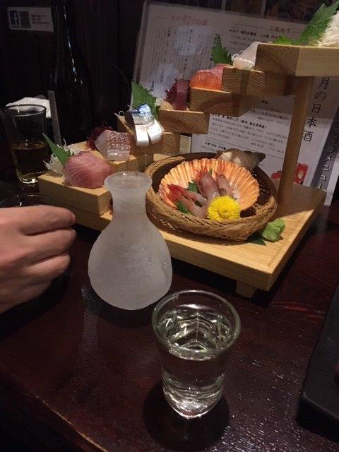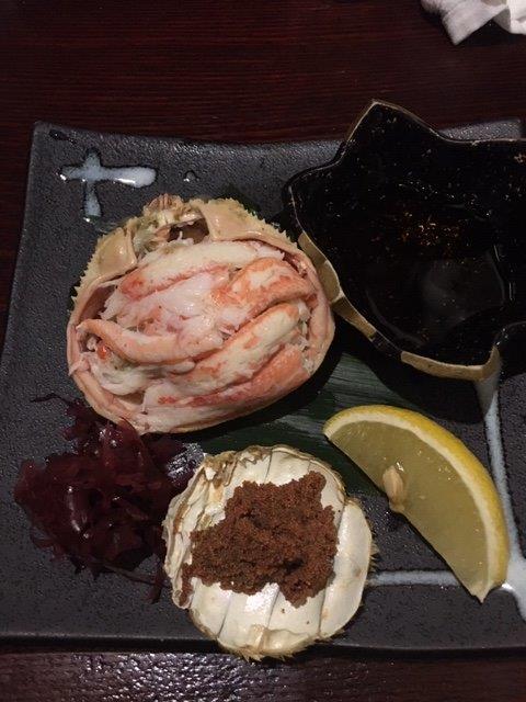 お通し、刺身盛り合わせ、女蟹、〆張鶴。どれもおいしかったです。やはり刺身には日本酒といった感じですね。翌日が心配だったので2合程度頂きました。