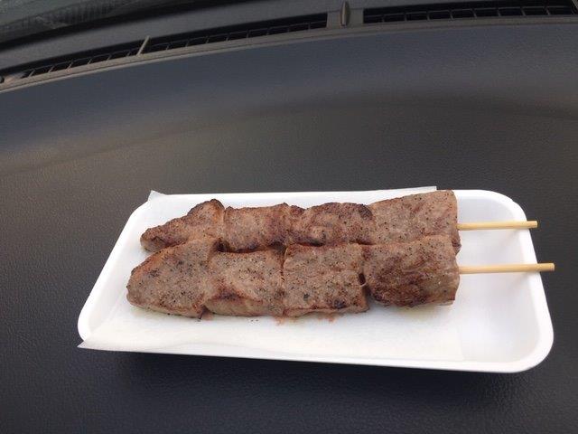 お腹が一杯になって幸せな気分にひたりつつもすぐにそこから車で移動してお肉屋さんのやま信さんへ。ここでは流石にご飯を食べるだけのゆとりがありません。村上牛のサーロインステーキ串を頂きました。これが、旨い、満腹な状態なのに旨い。